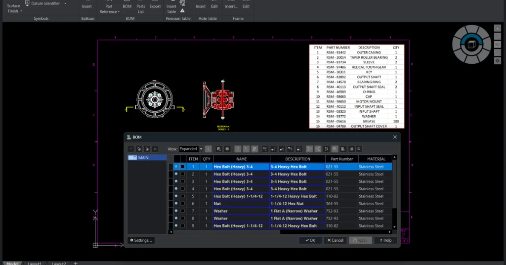 There’s a new BOM setting that enables you to select which properties to list and display in your bill of materials, part lists, and balloons.