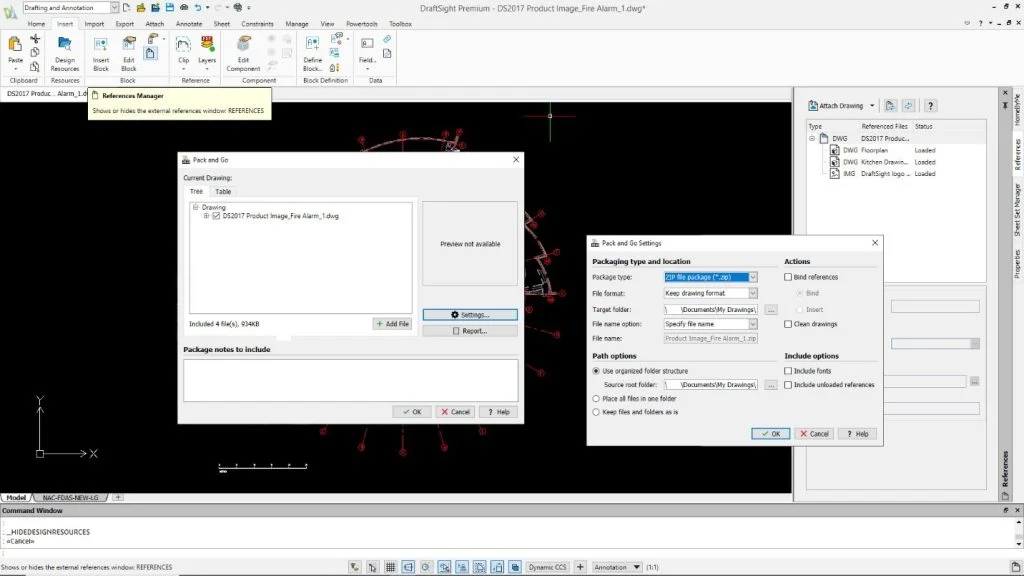 Sharing a drawing with external references is made easy in DraftSight with the Pack and Go ability. You can compress and share drawings with others while keeping the correct references intact, making collaboration seamless and efficient. You’re also given the option to customize the settings when compressing to reduce file sizes for when large DWGs need to be reduced and optimized.