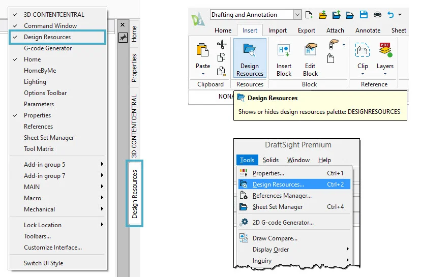 First things first – Design Resources is not displayed by default, so let’s discuss how to turn it on. Design Resources is a palette, so you can access it like you do any other palette – by right-clicking on a palette sidebar or anywhere in the Ribbon. It can also be found in the Ribbon under the Insert tab. Finally, if you use the Classic workspace, you can find it under the Tools pulldown. Or, similar to DesignCenter in AutoCAD, you can access it with CTRL-2 as well. The bottom line here – there are many ways to get to this amazing tool!