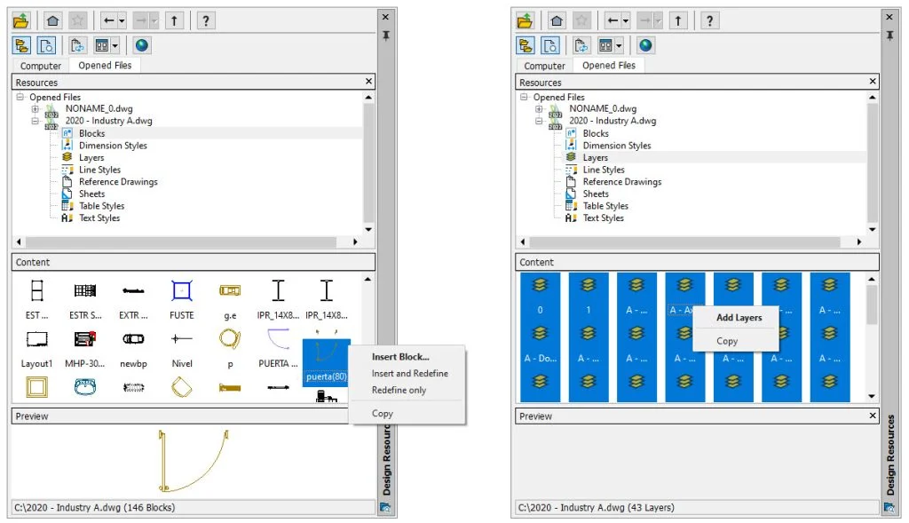 Let’s first concentrate on where you do the file navigation… within the Resources area, and in particular, the two tabs. One is Computer, and the other is Opened Files. Over the years, I’ve found that if I’m importing content from another drawing, it’s either A) one I already have open, or B) one I’ve opened recently. That’s why it’s my preference to use the Opened Files tab. It’s just easier to quickly find your content in Opened Files than it is navigating through the Computer tab (more on that tab in a minute).