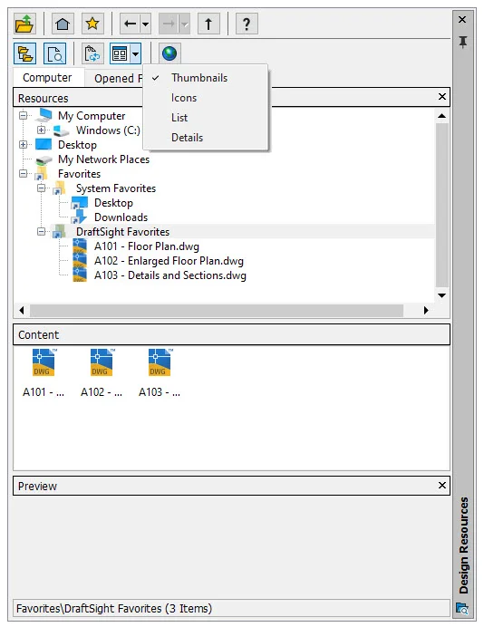 On the Computer tab, you’ll get the usual suspects (My Computer, Desktop, Network, etc.) but there is one cool item I want to share with you. Whenever you have a file or folder that you know you’ll be returning to, you can right click on it (from the Design Resource tool) to mark it as a Favorite. It will then appear in the DraftSight Favorites folder. Now I still tend to use my preferred method of Opened Files, but I know a lot of people who absolutely love using DraftSight Favorites.