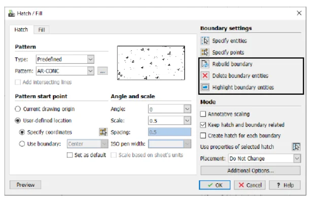 Other editing options include the ability to edit the pattern type, fill, and color. In addition to the presentation of the hatch, it is also possible to rebuild boundaries around hatch removed accidentally, to delete entities that are acting as hatch boundaries, or to highlight boundaries.