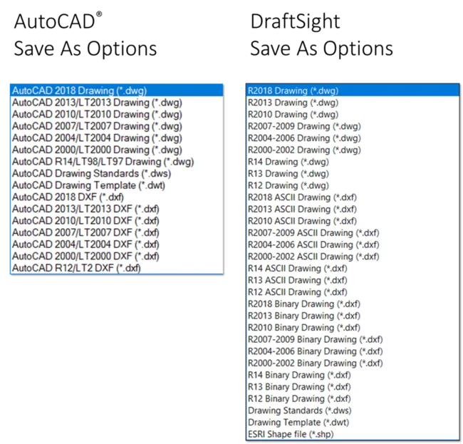 Check out DraftSight’s SAVEAS file type list. Look at all the versions and file types you can save back to in DraftSight. You will see that DraftSight allows you to save back even further than AutoCAD does. You can save a drawing file all the way back to an R12 drawing file. Not 2012, AutoCAD Release 12 from the early 90’s. DraftSight can sometimes even fix a corrupt legacy AutoCAD drawing file better than AutoCAD.