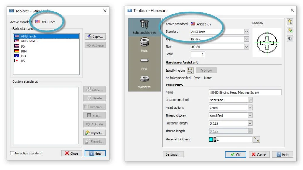 Once you’ve chosen or created your standard, you’re ready begin your 2D design. You can insert industry standard hardware in various 2D views by choosing from a comprehensive collection of bolts and screws, nuts, pins, and washers.