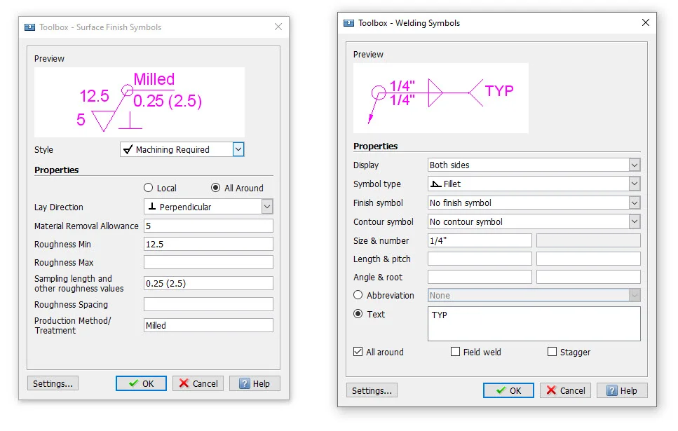 Once your design is finalized, DraftSight can assist you to develop your annotations. You have the ability to create and preview Surface Finishes and Welding Symbols which will increase your efficiency, accuracy, and standardization in your drawings.