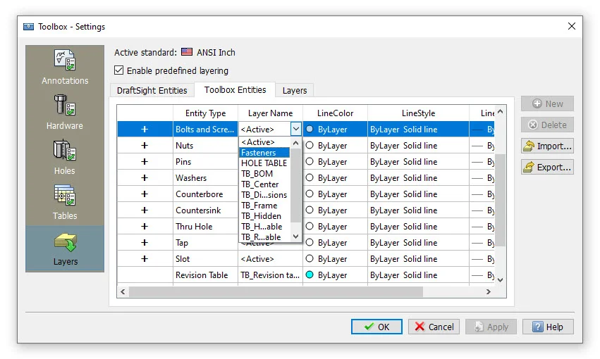 DraftSight’s Mechanical Toolbox can help you adhere to your CAD Standards by enabling predefined layer assignments for Toolbox entities or even regular DraftSight entities. By using the Toolbox Layers feature, you can concentrate more on your design, and less on your CAD layering tasks.