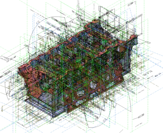 There are also other automation tools to create 3D PMI based on legacy models and associated 2D drawings. For instance, according to DrawToPMI benchmark test by ITI TranscenData, this engine block in CATIA format below contains 6 drawing sheets, 58 views and more than 1,000 PMI entities. Manual PMI recreation took 50 Hours while DrawtoPMI only needed 4 Hours (1 hour automatic process and 3 hours manual optional completion).