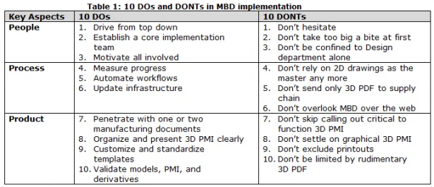 In a previous post on Model-Based Definition (MBD) Implementation, “Don’t hesitate Part 1,” there was a comment posted by Kevin De Smet regarding legacy data: “3,000 models with drawings. You are going to re-do all that?” This raised an important point: Automate workflows in Table 1. Modern manufacturing has become increasingly more complicated. For example, a SOLIDWORKS user in Europe mentioned they have millions of parts, assemblies, and drawings in their data management systems. Automation is indispensable not only because of the large amount of data, but also because it can help enforce consistency, company standards, and quality.