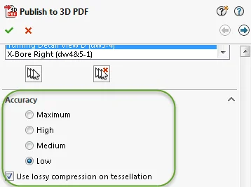 First, it brings both high data accuracy and great flexibility. Actually the differences between a SOLIDWORKS model and its 3D PDF model can be controlled within 1 micron, or one millionth of a meter, which can meet most machining and inspection needs. Furthermore, with a new enhancement in SOLIDWORKS MBD 2017, you can also adjust different accuracy levels and compression options during publishing as shown above.