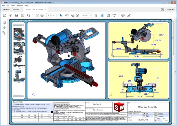The second advantage of the 3D PDF files published by SOLIDWORKS MBD is the data richness. It includes not only a model in one viewport, but also the 3D annotations, professional sheet layouts, multiple sheets, multiple viewports, multiple tables, mapped SOLIDWORKS custom properties, configurations, and 3D views. You may download and check out several samples of a miter saw assembly and a container assembly. Please save these documents first, open with Adobe Reader rather than your internet browser, click on “trust this documents,” and click on white viewports to activate the 3D content. For more detailed 3D PDF instructions, please watch this video.