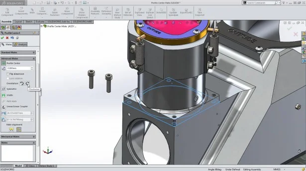 Big timesavers. Several new enhancements will save you lots of time. The Profile Center mate locates the center of two items to each other regardless of their shape or size. Another nifty new feature, the Split tool enables you split one surface body into two. Selection sets now include faces, edges, features and bodies. Another new feature enables you to select a hidden component in the feature tree and it will temporarily appear in “ghost” form.