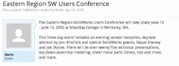 Since 1997, I feel in love with SOLIDWORKS with my MassBay College students. Hosting User Group meetings & Eastern Conference (2005) allowed me to share my passion with great support from the Concord office and 4 area Resellers.