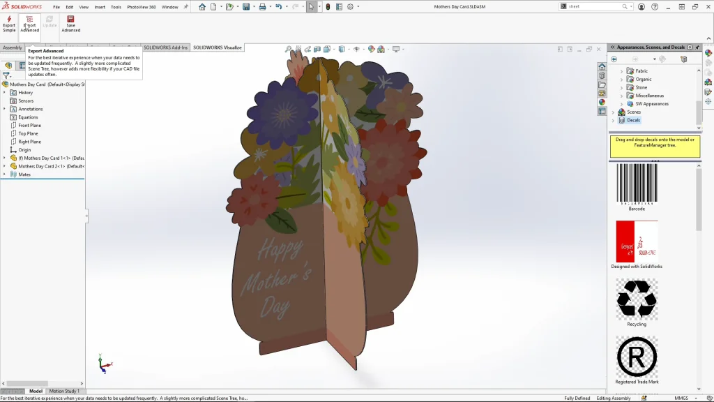 Once decals are applied to both sides of the card, I can save it as Mother’s Day card 1, but keep the part open. The same shape can be edited to create the other slotting card piece. The thin cut extruded slot was flipped to cut away from the top side of the card, and the decals were edited, and images were swapped out for the other decals. his could then be saved as Mother’s Day card 2. The parts were then mated and slotted together within an assembly. Saving the assembly, I could select the SOLIDWORKS VISUALIZE tab and the export advanced option.