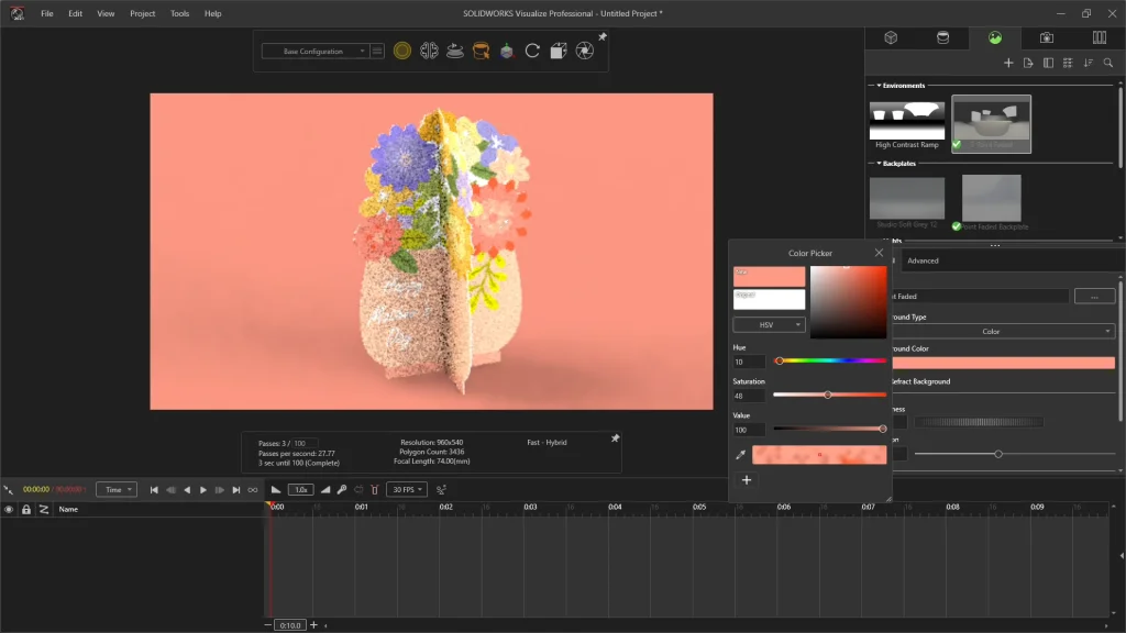 When the model opens in VISUALIZE, I start by resizing the camera aspect ratio to 16 by 9. Under the scenes tab, I like to hide the backplate by selecting it and then unchecking visible. Then under the scenes tab I prefer to change the environment to a color. Selecting into the background color bar, I can select any color from the swatch, or use the color control bars, or even use the picker tool to drag over the model and pick out a color, this can then be edited to a lighter shade, which will complement the colors already in your model.