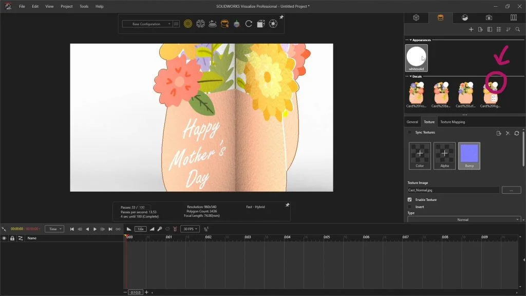 While in VISUALIZE I can edit any of my appearances with a wide range of settings. This can include adding texture, I decided to add a bump texture to the card to give it a card stock appearance, for this effect I used the cast normal texture, the tile was scaled down further to make the texture more realistic. To make the applied card appearance visible through and under the decals surface, you need to assign the appearance to each decal. You can see that an appearance is assigned by the little circle appearance icon attached to the top right corner of the decal thumbnails.