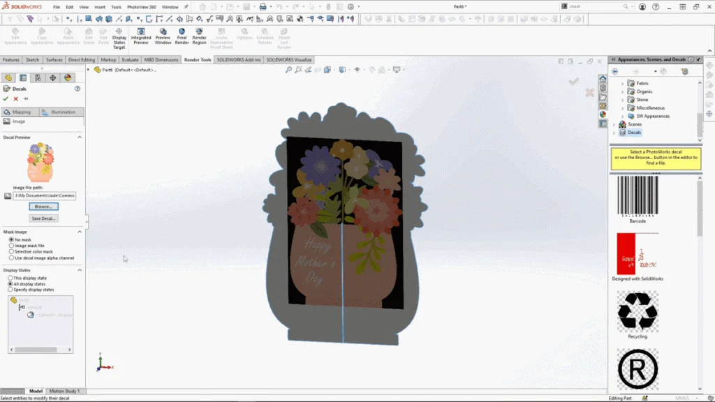 I have designed many cards in SOLIDWORKS before, creating a 3D image to render and print flat onto a card, for this Mother’s Day card, I wanted to try something a little different and create the finished card in SOLIDWORKS. This is a very simple tutorial, and within it I will show you how to insert a DXF file, add custom decals and export the finished card model for rendering within SOLIDWORKS VISUALIZE. If you want to follow the tutorial, the DXF file and decals are available to download here