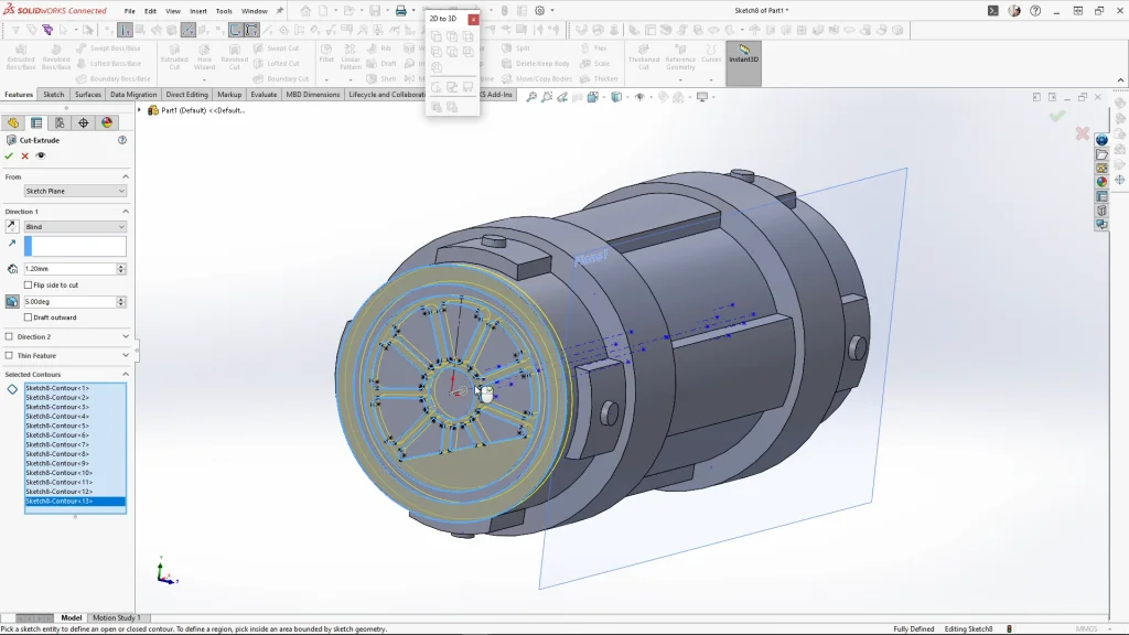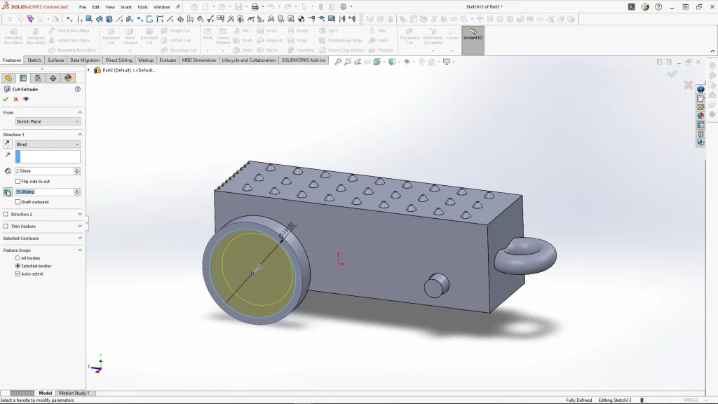 When the sketch came in, I fixed the whole sketch to fully define it. I then cut extrude by 1.2mm with a 5-degree draft angle to help the stamp release easier.