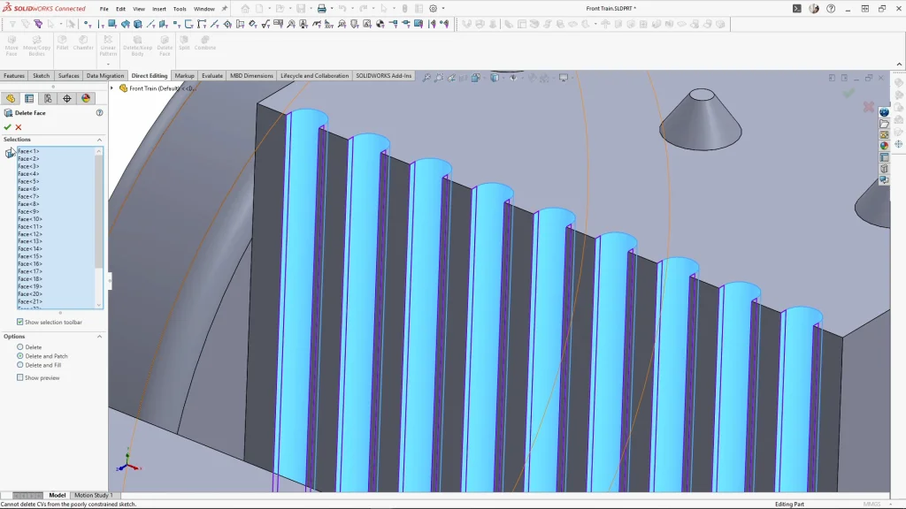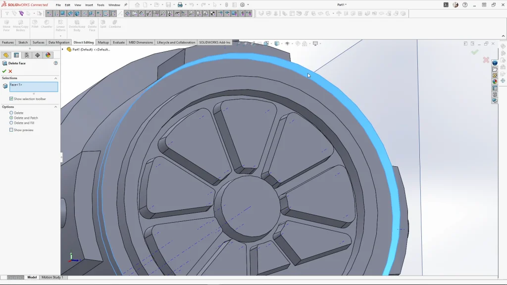 Once applied you’ll see below I was left with an outer wall left from the draft angle cut. To remove this, I used the direct editing tab and delete face. Under options I used delete and patch selected. Selecting the face and delete it removes and patches the part.