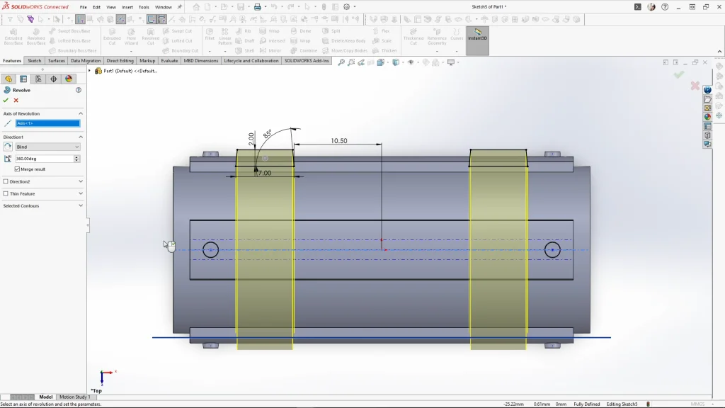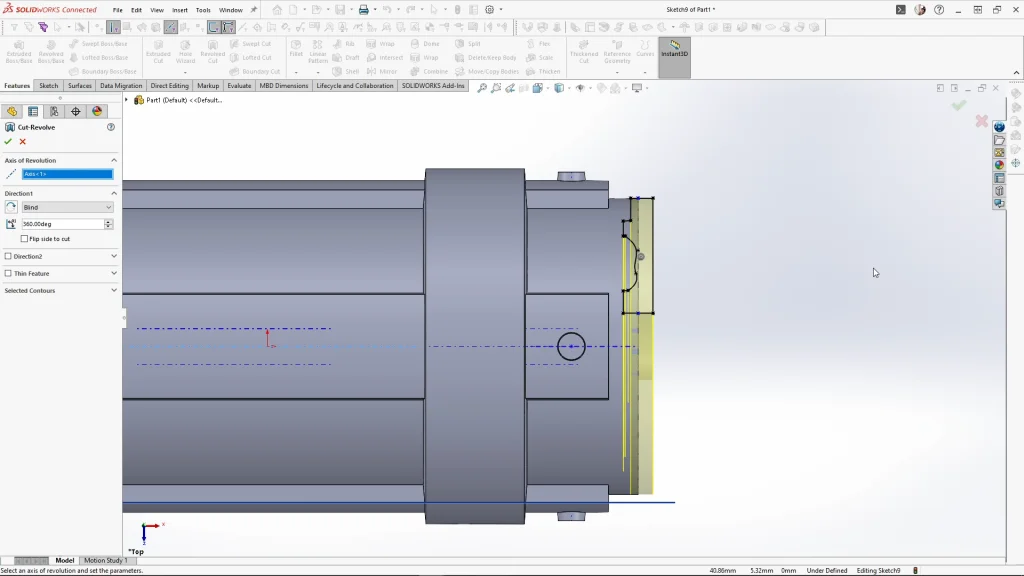 For the opposite side of the roller, Instead of cutting the sketch, I used revolve cut. Selecting the top plane and insert, DXF, I imported the second wheel DXF file. Repeating the same import settings, the sketch came in, and was moved and fixed into place. I then revolve cut the sketch from the rollers center axis.