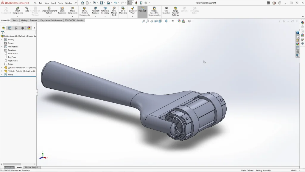 For the roller to sit onto the handle I needed to add some holes to both ends of the roller wheel. With the roller wheel done, I saved it and brought the part into the handle’s assembly and mated it into place using a concentric mate and a width mate to center the roller wheel within the handle.