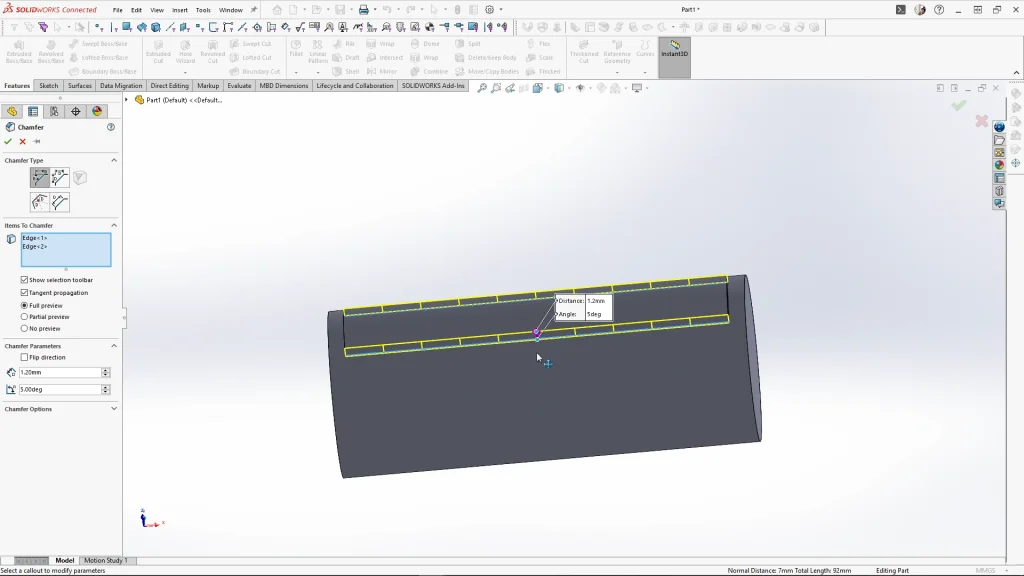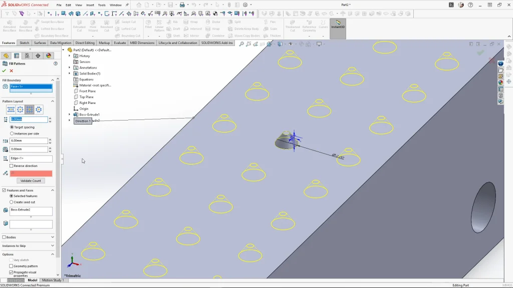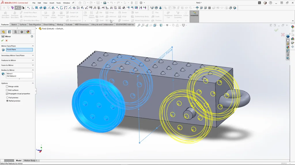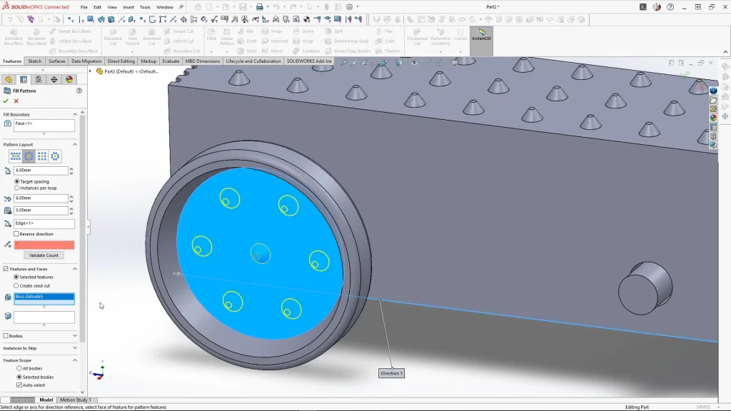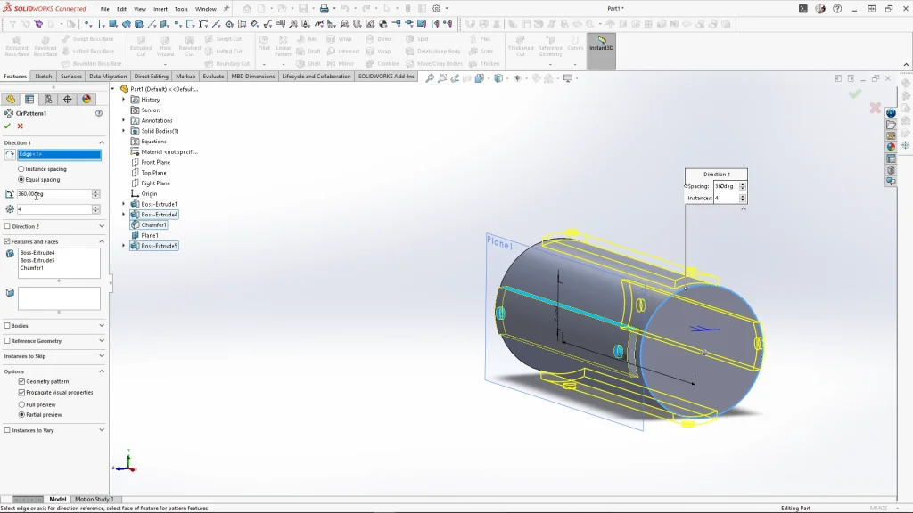 From here, I used the circular pattern feature and selected the two boss extrusions and the chamfer feature for the features to pattern, then the circular edge for the direction to pattern, for this I patterned 4 instances with equal spacing.