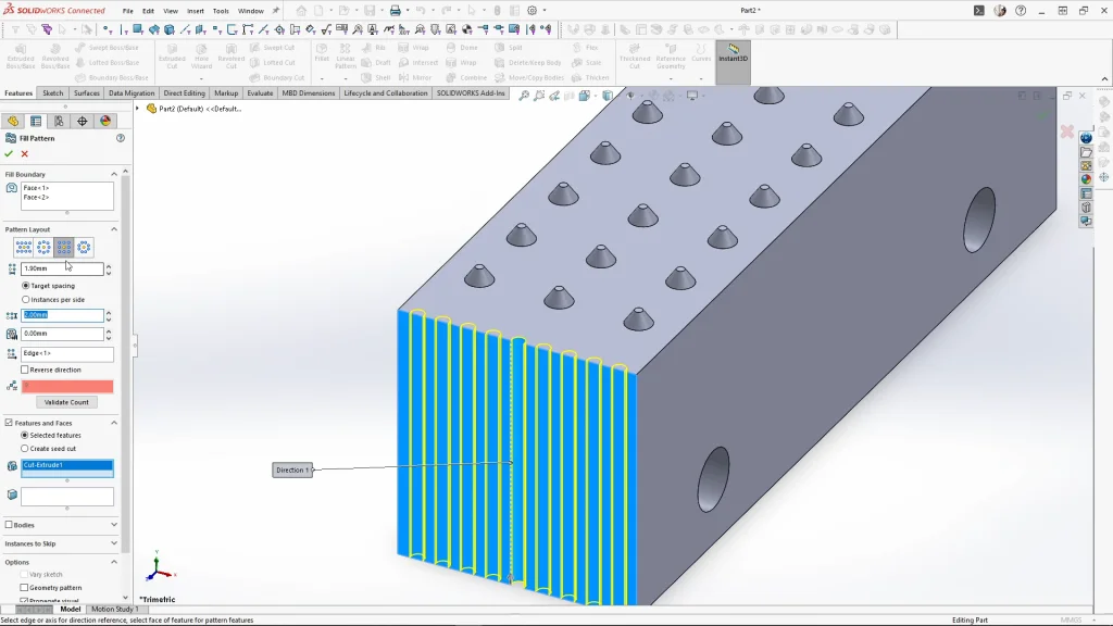 Sketching onto the front face of the carriage, I used the slot to sketch a short curved indent on the midpoint of the edge. Then extrude cut the sketch through all. Using the fill pattern again, I then selected the front faces for the fill boundary, and selected the cut for the pattern feature. Spacing them apart by 1.9mm both ways and apply it. This surface can be used to press dough onto the front of the train to add more playability to the train.