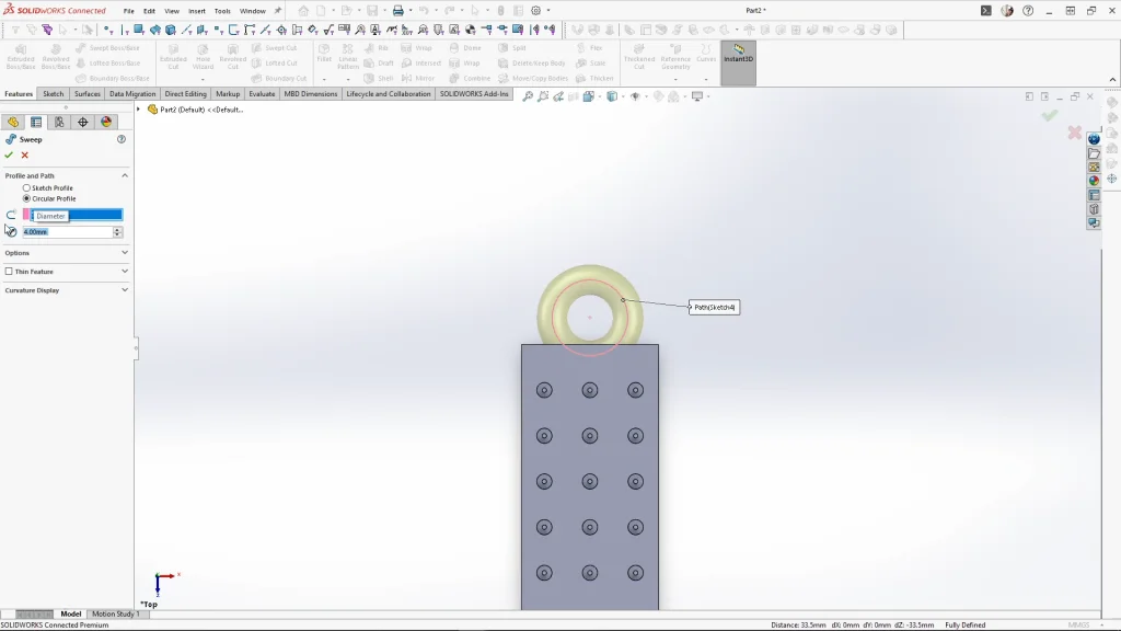Sketching onto the top plane, I sketched a 10mm circle and fully defined the sketch. Then I used the sweep feature with the circular profile option, the sketch as my path, and a 4mm diameter, merging the result. This creates a loop for linking carriages.