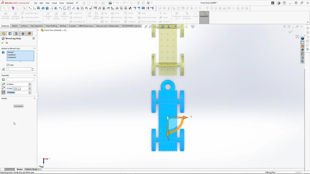 Keeping the part open, I used the move/copy bodies feature to move and create one copy of the train and space it back by 74.5mm. I wanted the back carriage to be a part that can be printed multiple times and reconnected to the train, so I needed to remove the texture on the front of the carriage.