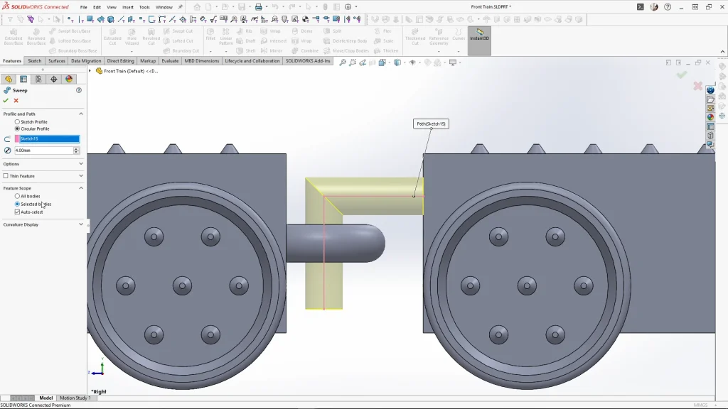 Sketching onto the right plane, I used the line to sketch a train hook for connecting the carriages together. Fully defining the sketch, I used the sweep feature with circular profile to sweep the sketch by 4mm.