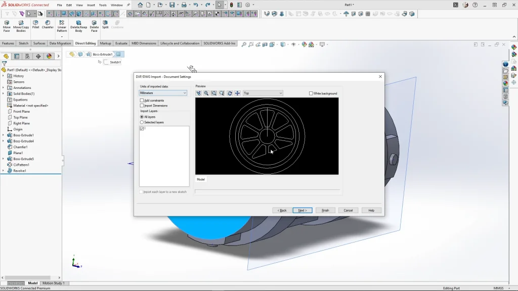 Moving onto the wheel stamp ends of the roller, I started by selecting the left side end face of the roller, insert and DXF. Here I imported the Wheel DXF 1 file. Under the DXF import settings, I unchecked the import as reference box, and next. Double checking my units were in millimeters, I could see the DXF sketch preview box and select finish to bring in my DXF as a sketch.