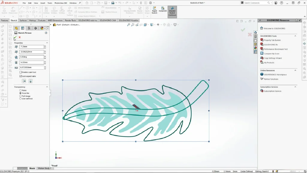 The PNG image I created for the earrings has been drawn in a vector software, and the lines have been colored differently for each feature. The PNG file was brought in as a sketch picture, the image transparency was changed to from file so that the background of the image disappeared. This can make it easier to see where it is being placed. The image was centered and resized onto the earring stem, one tip I would give is to always untick enable scale tool when you resize a shape, as it becomes part of the model, so when you change your views the SOLIDWORKS window zooms out to account for this. Once the image is in place the sketch was closed.