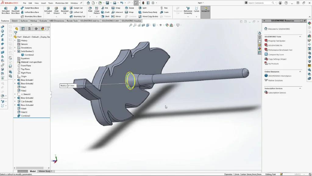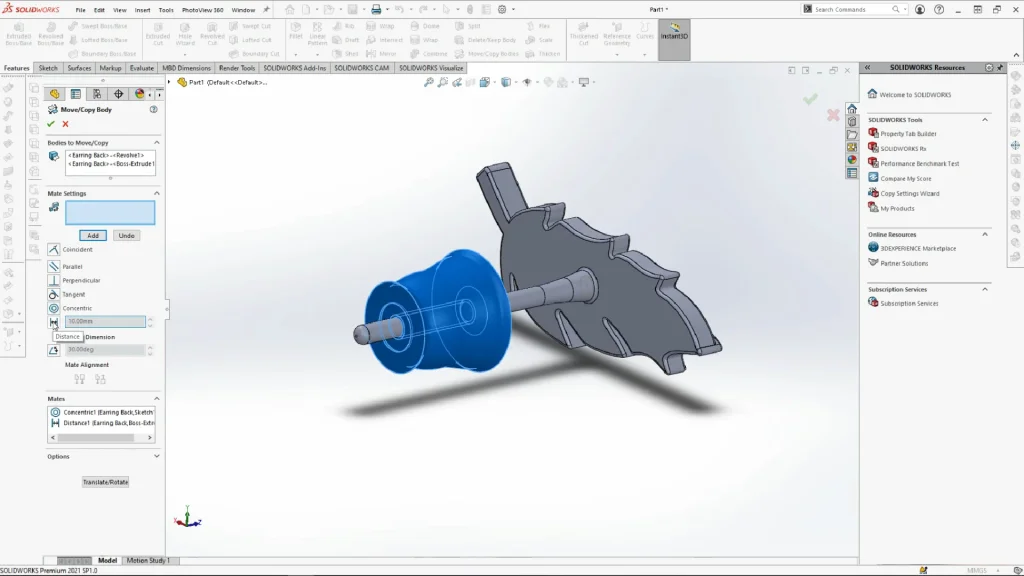 The earring back part was inserted into the part and mated into place using move/copy bodies and the constraints tool. The constraints tool allows you to mate parts into place as you would in an assembly. A concentric mate was applied to center the earring back onto the stem, while a coincident mate was used with a specified distance to add space between the earring back and the feather.