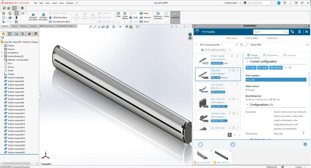 - 3DEXPERIENCE Part Supply: With integration of Part Supply from within 3DEXPERIENCE, the 3D Components you need are now at your fingertips for free right from the context of your design session. Customers can additionally set up a common library in a collaborative space with their standard parts and use them directly in their designs. Powerful search capabilities in the 3DEXPERIENCE platform makes it easier to find and reuse any existing data.