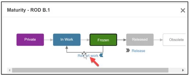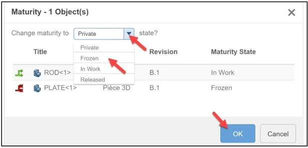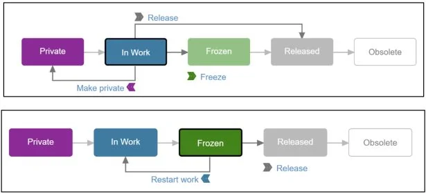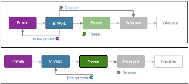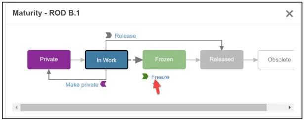 Maturity. Defines the Maturity state of a component as it evolves throughout its lifecycle: Private (documents are only accessible to the owner and are not shared in the Collaborative space), In Work (documents are initially saved to the In Work state and are accessible in the Collaborative space), Frozen (documents are typically set Frozen while in review to prevent change), Released (documents are typically set to Released when in production. Released documents cannot be modified), Obsolete (documents are typically set to Obsolete when no longer used).