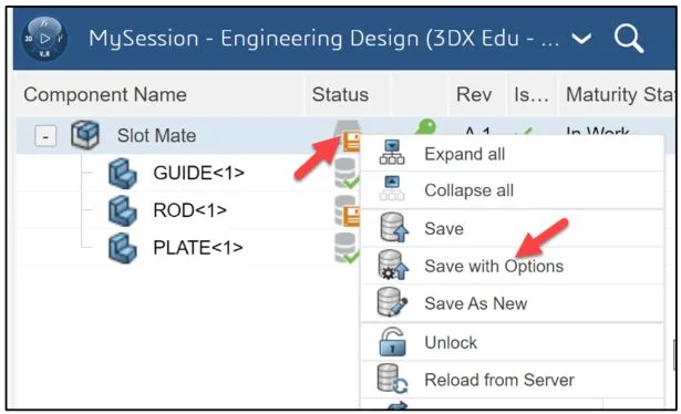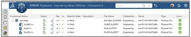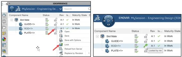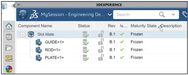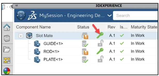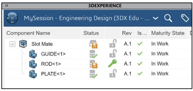 View the updated MySession panel. You created a new revision. The Collaborative Lifecycle App locked the assembly. No changes can be made by anyone in your Collaborative space. Save the assembly to the platform. The Maturity State displays “In Work”.