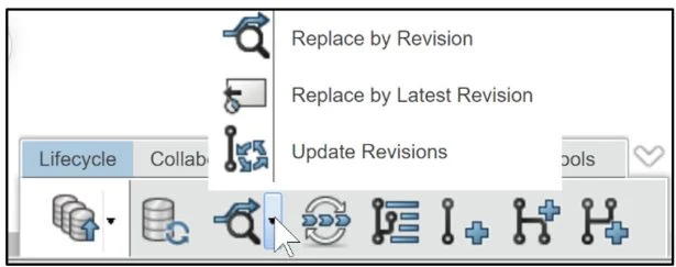 Replace By Revision. Opens the Replace by Revision dialog box to replace the revision that is opened in the SOLIDWORKS session. There are two sub-options: Update Revisions (Opens the Replace by Revision dialog box to replace the revision that is opened in session), Replace by Latest Revision (Updates the revision for the selected object with the latest revision).