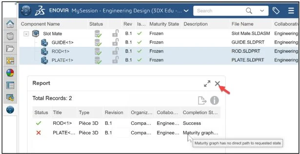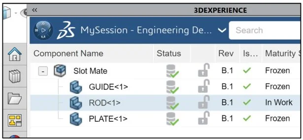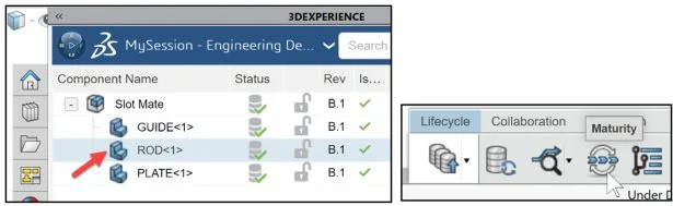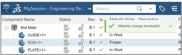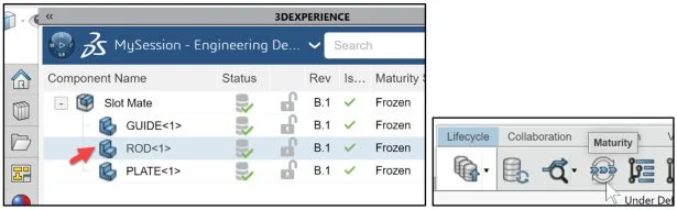 View the Maturity state of two components ROD (In Work) and PLATE (Frozen).