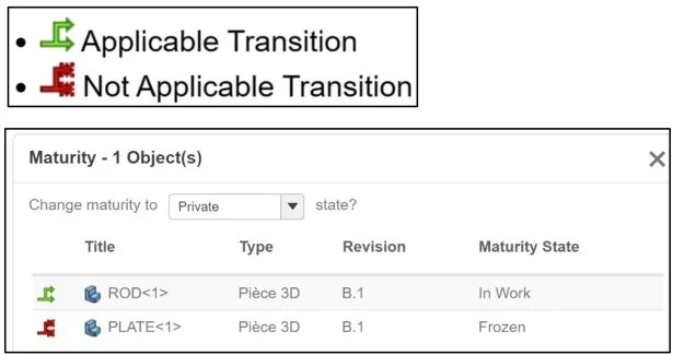 Note: To exclude an object and not apply the maturity transition to it, double-click the corresponding Applicable Transition icon. The icon changes to (Not Applied Transition) and the object’s maturity state is not modified when the Maturity transition is applied.