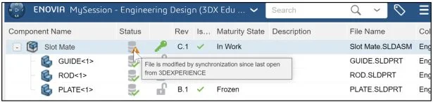 The MySession panel also displays the Component Name, Status (Displays an icon that represents the status of a given revision, saved or not saved to the platform), Locked status (Locked or Unlocked), Rev (Revision #), Is Last Revision (Yes/No), Maturity State (Lifecycle state of the family, for example: Private, In Work, Frozen, Released, Obsolete), Description, File Name (Displays the PLM external ID of the object for reference objects and the PLM external ID of the connection for instances) and Type (Physical Product or Drawing).