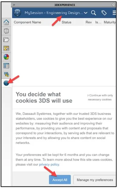 Click the 3DEXPERIENCE icon in the Task Pane. The MySession panel is displayed. This displays the two-way communication between SOLIDWORKS running on your machine and the 3DEXPERIENCE platform running in the cloud. If needed, Click Accept All.