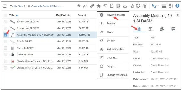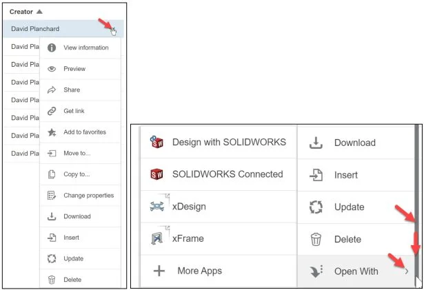 Click the drop-down arrow as illustrated. View the available tools: View information, Preview, Share, Get Link, Add to favorites, Move to, Copy to, Change properties, Download, Insert, Update, Delete, Open With (Design with SOLIDWORKS, SOLIDWORKS Connected, xDesign, xFrame, and More Apps). The More Apps tool brings you to your My Apps section under the 3DEXPERIENCE platform compass.