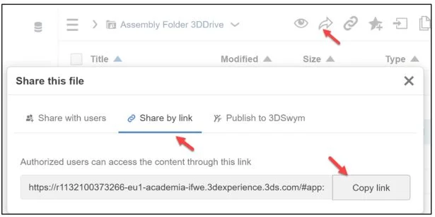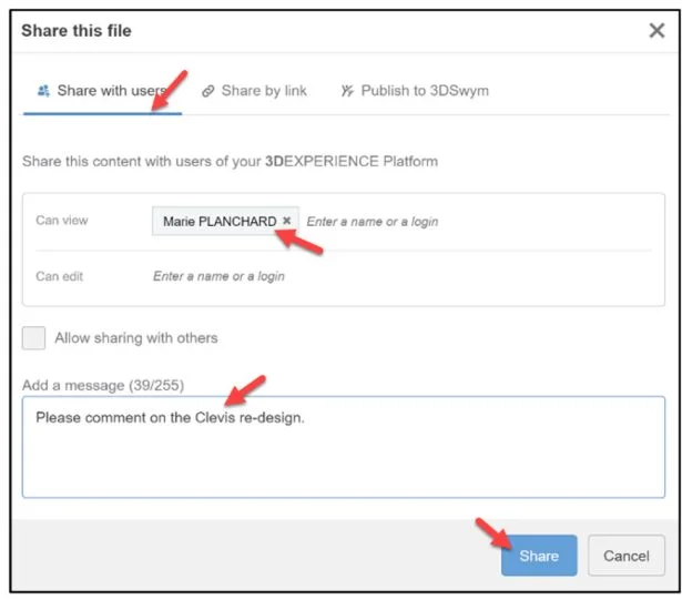 Use the Share with users tab to share files with members in your Collaborative space. Use Share by link to share a link (from the platform) to anyone outside of your Collaborative space. Use Publish to 3DSwym to start a conversation and collaborate on a post about your design. You can choose to publish as a post, a media, a question, or an idea.
