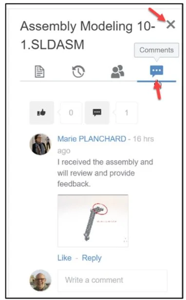 Click the Comments tab. I started a conversation to another engineer in my Collaborative space.