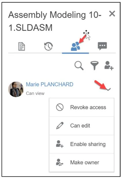View the available tools: Revoke access, Can edit, Enable sharing (with others), Make owner. Note: When the sharing of the link is finished, you can remove the person. No file is provided. This ensures security on the platform of your design.