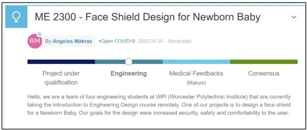 My WPI remote ME2300 Engineering design class took advantage of the Open COVID19 community. The class was divided into teams of four students. Our focus was designing and manufacturing a cost-effective full-face shield for a new born baby. Up to this time, most of the designs were targeted for adults.