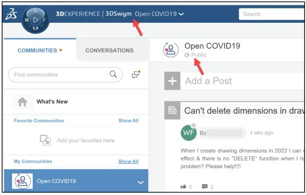 Search for a community. Note: You can also use a direct link with any browser Open COVID19 Community URL: 3DSwym Open COVID19