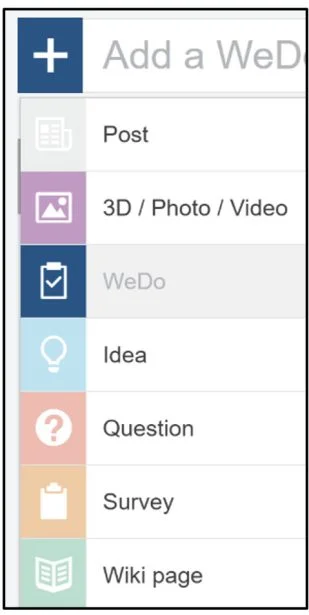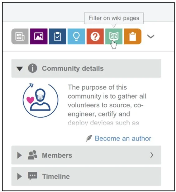 Once your community has grown, you can filter on the posts by: Timelines, Media, WeDos, Ideas, Questions, Wiki pages, and Surveys.