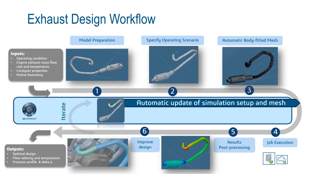 From a design engineering perspective, and for all our Simulation roles, a typical workflow is shown above, in this case for an exhaust design. Reading in the CAD geometry and doing some model preparation for Simulation, if necessary, you specify the operating scenario by imposing appropriate boundary conditions; have the program generate the mesh; execute the job either locally on desktop or remotely in cloud; and post-process the results. To improve your design and study alternatives, you make changes, with the program automatically updating the simulation setup and re-meshing, solving and post-processing. You iterate through this process until you are satisfied with your design.