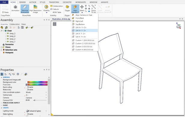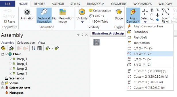 - Click on the arrow of the Align Camera icon in the Home Select one of the ¾ views from the list. Usually, these four views will be sufficient to create all you illustrations. By choosing one of them, you will always get the same view of your product.