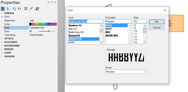 In the Text field of the Properties pane, click on the button with the three dots behind the font. The font window appears.